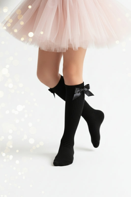 Mädchen Kniestrümpfe mit Schleifen - süße knielange Strümpfe schwarz