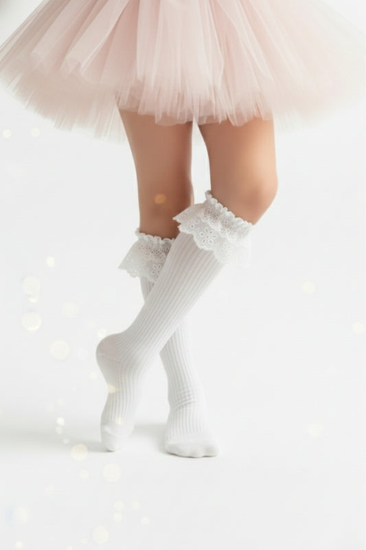 Mädchen Kniestrümpfe mit Rüschen - süße knielange Strümpfe wollweiß