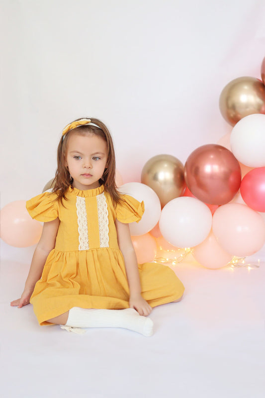 Kleid Laila - Senfgelbes Baumwollkleid mit Spitzendetails und Haarband