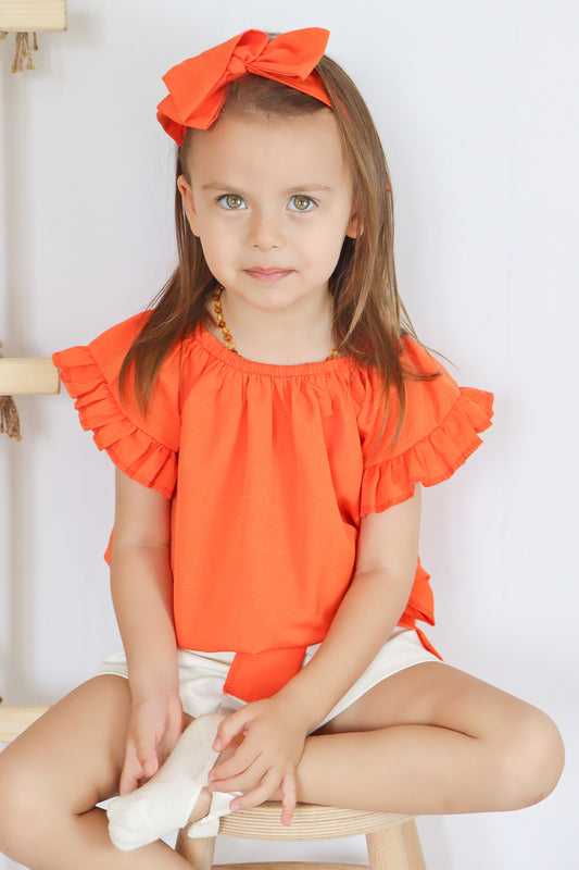 Set Sunny - dreiteiliges Set - orangenes Oberteil, weiße Jeans Shorts und Haarband