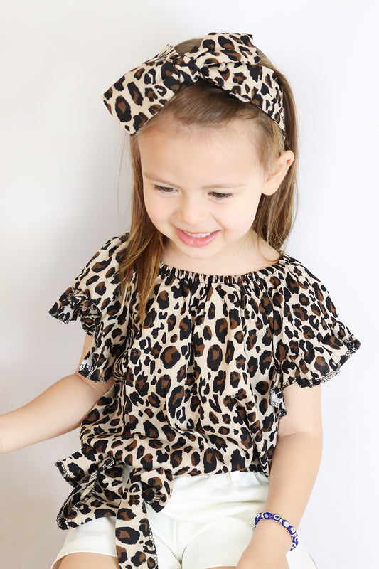 Dreiteiliges Set Leo - schwarzes kurzarm Oberteil, Schlaghose und Haarband mit Leopardenmuster