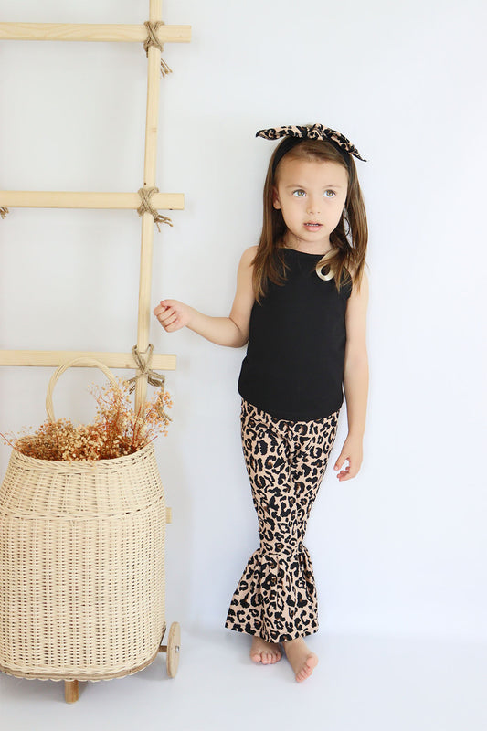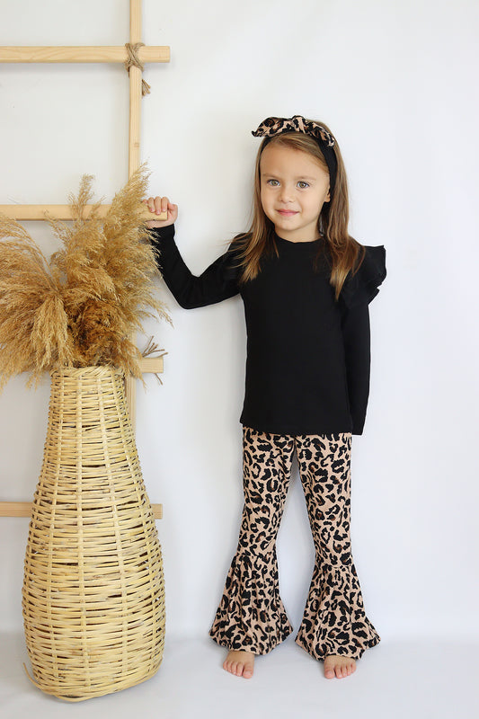Dreiteiliges Set Leo - schwarzes langarm Oberteil, Schlaghose und Haarband mit Leopardenmuster