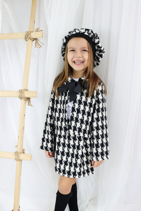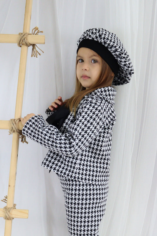 Dreiteiliges Set Lizbon - Blazer, Schlaghose und Mütze im schwarz-weiß Hahnentritt-Muster