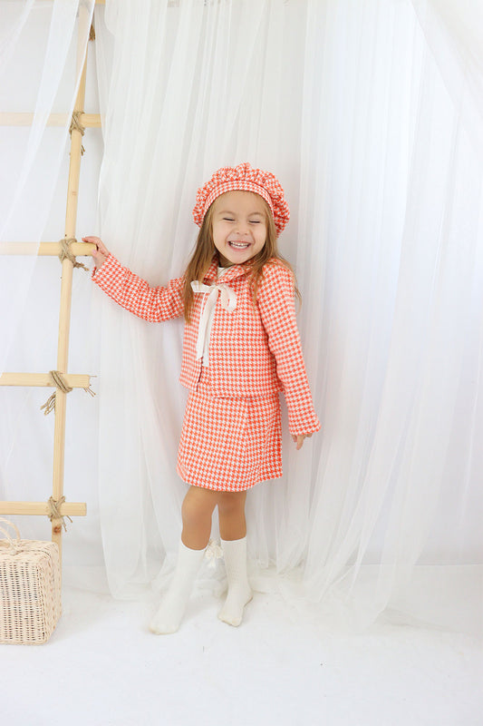 Dreiteiliges Set Santa - Blazer, Kleid und Mütze in cremefarbenem und orangenem Hahnentritt Muster