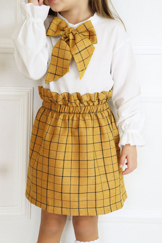 Set Laura - senfarben gemusterter Rock mit Raffung und weißer Bluse mit passender Schleife