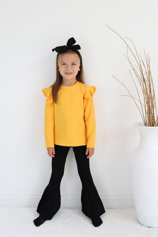 Dreiteiliges Set Violet - senfgelbes langarm Oberteil mit Rüschen und Volantärmeln, schwarzer Schlaghose und Haarband