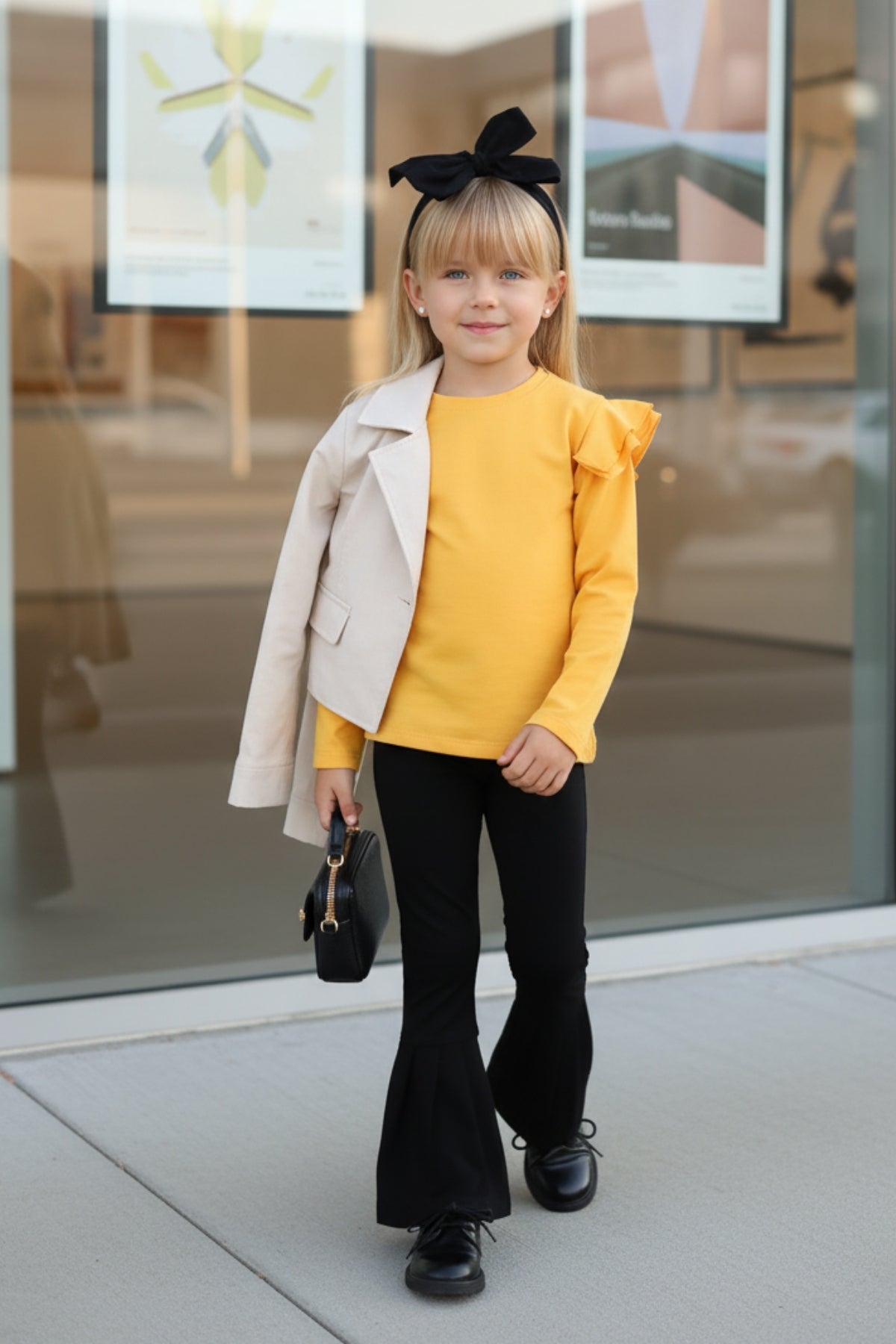 Das Set besteht aus einem senfgelben Langarm-Oberteil, einer schwarzen Schlaghose mit Rüschen am Saum, sowie einem Haarband mit Schleife.